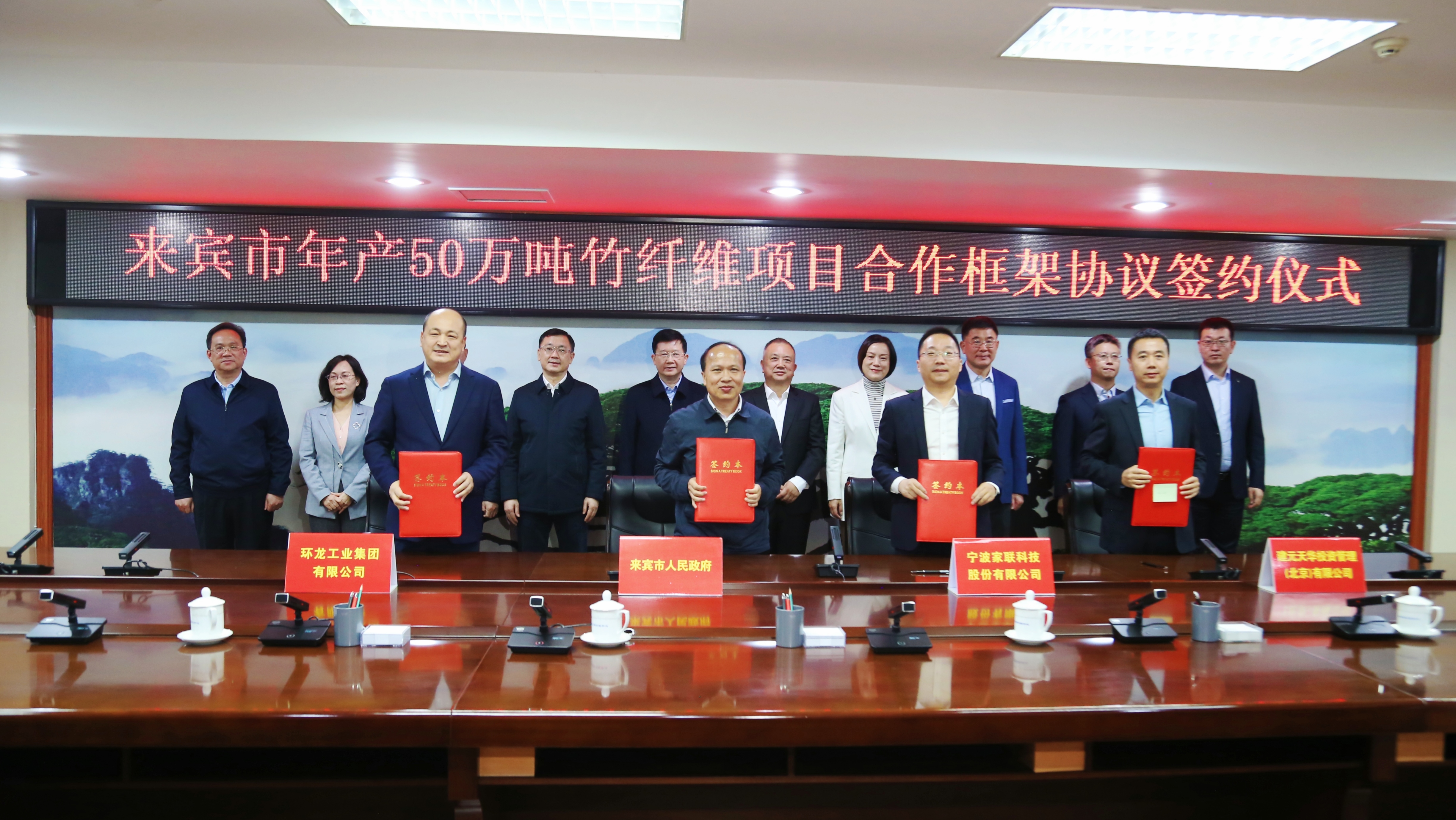 年產50萬噸竹纖維項目環龍集團 × 廣西來賓市2024年3月13日,廣西壯族自治區來賓市“年產50萬噸竹纖維項目簽約儀式”在來賓市人民政府正式舉行。環龍工業集團有限公司、寧波家聯科技股份有限公司、建元天華投資管理有限公司共同與來賓市政府簽署合作協議,來賓市市委書記何朝建,來賓市市委副書記、市長廖和明,來賓市市委常委、秘書長熊健等領導蒞臨簽約儀式。該項目立足來賓市的竹資源特色,充分發揮環龍集團在竹種培育、竹林種植、竹纖維提取及深加工的科技力量和成熟產業經驗,響應“以竹代塑”政策,深入踐行“綠水青山就是金山銀山”綠色發展理念。項目占地1500畝,建成后可形成替塑竹纖維材料、特色高性能竹纖維材料及其相應后端產品,包括紙漿模塑、生活護理用品、生活用紙和包裝紙等各類環保產品。全產業鏈通過項目前端對竹林原料建設、物流配套工廠以及各類成品加工的建設,帶動自身及周邊產業總產值預計共計可達400億元,為來賓市的農民增收、替塑包裝等產業集群發展助力。環龍工業集團有限公司董事長沈根蓮、環龍工業集團有限公司副總裁李叢峰一行出席簽約儀式。-END-復制搜一搜分享收藏劃線人劃線